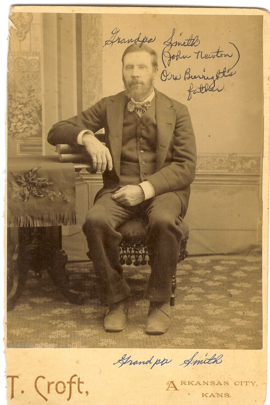 SMITH, son of Christopher SMITH and Sarah WALLACE. Born Oct 31, 1829 in Point Pleasant, Clermont Co., OH. He died 2 May 1900 in Grant or Garfield Co., OK. Buried in Grant Co., OK. He married Rebecca WILSON who was born in Moscow or Cincinnati, (daughter of Matthew James WILSON and Anne MANNING), in Clermont Co., OH 17 April 1851. She died 11 Dec. 1913 in Enid, Garfield Co., OK Family history says that the Wallace's were from across the river in Kentucky and that Sarah died when John was about 6 months old, which would be about April or May 1830. (I haven't found the record yet.) Also that Christopher had a Grist Mill on the Ohio River at Point Pleasant, but haven't found any proof of that except family stories. John is my 2nd great grandfather. |